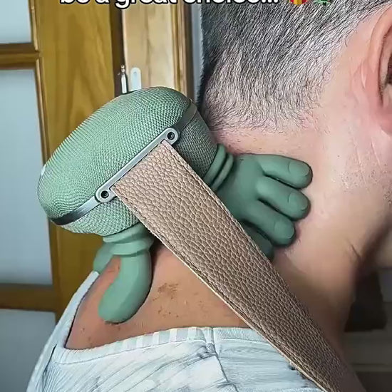 Video demo – person using massager on shoulders and neck, relaxed expression